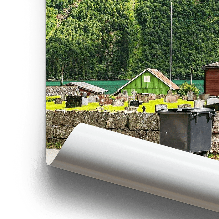 Koop de foto Kerk en huizen in Fjærland in Noorwegen van Rico Ködder op canvas, aluminium dibond, (ingelijste) fotoprint, behang en ArtFrame, op maat geprint in Fine-Art kwaliteit.