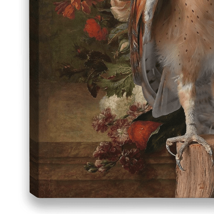 Deze kerkuil matcht qua kleur prachtig met het 18de eeuwse schilderij van een bloemstilleven. De uil komt uit de Betuwe het schilderij is te bewonderen in het Rijksmuseum in Amsterdam. Een landelijk stilleven met warme kleurtonen.