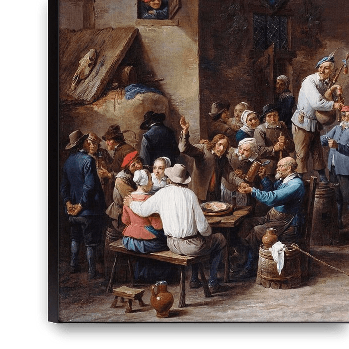 Net als Bruegel creëert Teniers episodes waarin we de ondeugden van Lechery (in de man die een vrouw rechts van het midden molesteert), Wrath (twee mannen worden op de achtergrond van elkaar weggehouden), dronkenschap (in de figuur die hem rechtsonder uitslaapt) en algemene lompheid (doorlopend gezien) kunnen herkennen. De stemming is echter veel meer gericht op karakteristiek gedrag (de twee verzegelen een koopje naar links), onzorgvuldige dwaasheid en komische hoogdravendheid, vooral bij het hoofdpaar dat danst met zo'n vrolijke en onoordeelkundige overgave. De manier waarop de oude man naar links kijkt suggereert de toegeeflijke wijsheid van de dorpsoudste. Het is verleidelijk om te concluderen dat dit gelukkige tafereel een viering is van de Vrede van Munster van 1648.