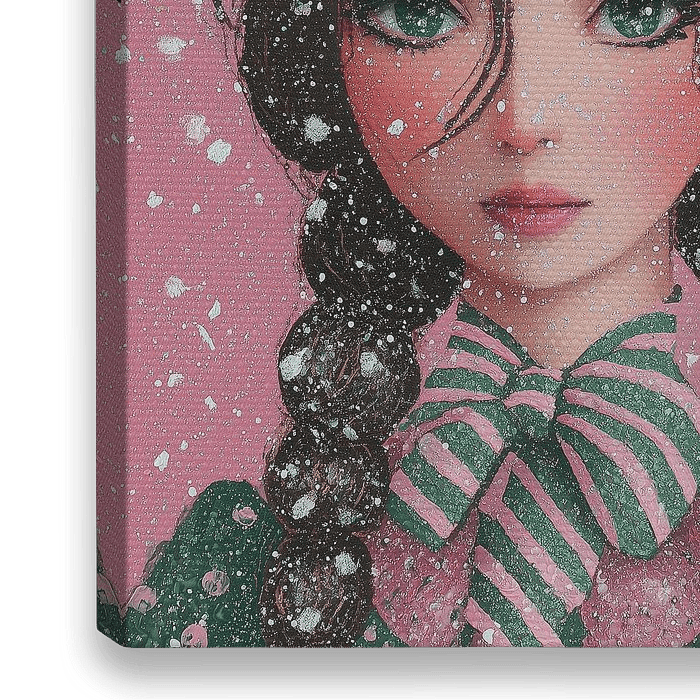 Kerst Hoed - Een speelse winterstek: in het midden staat een meisje met een hoed die lijkt op een miniatuur kerstboom — vol dennentakken en een grote feestelijke strik — terwijl zachte sneeuwvlokken als verfspatten over het hele beeld dwarrelen. Het werk combineert direct herkenbare kersticonen met een moderne, bijna surrealistische…