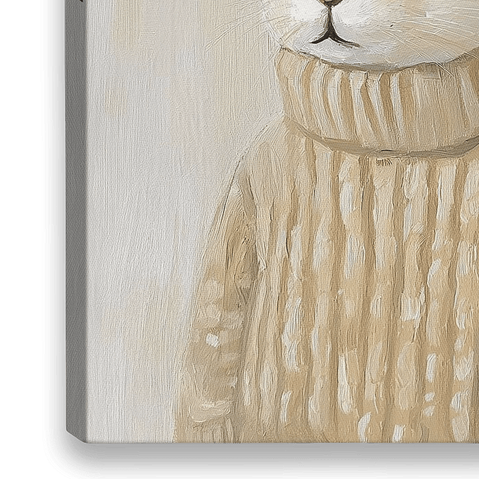 Kerst Konijn Trui - Dit dieren schilderij toont een schattig konijn in een beige wintertrui tegen een zachtkleurige achtergrond, met nadruk op zachtheid en een vredige uitstraling, passend bij het thema Kerst.