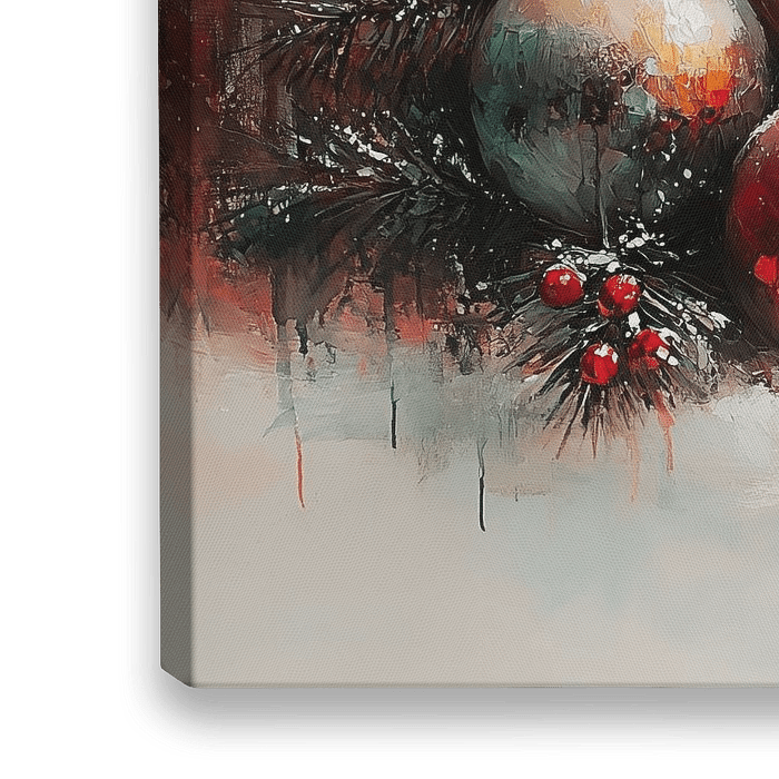 Kerst Sfeer | Feestelijke Kerstballen en Groen - Dit Kerst schilderij toont een speels arrangement van glanzende, rijkelijk rode en zilveren kerstballen, genesteld tussen diepgroene dennen takken en felrode besjes, allemaal badend in een warm, diffuus licht dat de feestelijke sfeer benadrukt.