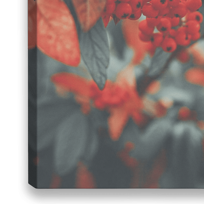 De lijster bessen, vuurdoorn en meidoorn doen het prachtig als kerst decoratie. Kies in plaats van de bekende krans eens voor iets nieuws zoals deze foto van kerst bessen in rood en grijs tinten voor aan de muur.