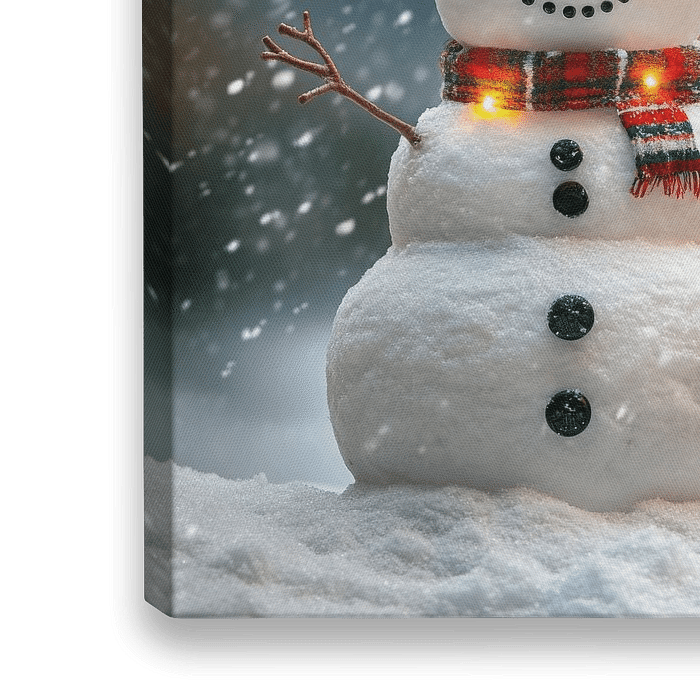 Een betoverende sneeuwpop, bekroond door een glinsterende kerstboom en glinsterende lichtjes, brengt winterse vreugde. Zijn vrolijke glimlach en feestelijke decoratie fleuren het koude, besneeuwde landschap op en creëren een uitnodigende sfeer. Perfect voor de woonkamer om kerstsfeer en gezelligheid te verspreiden.