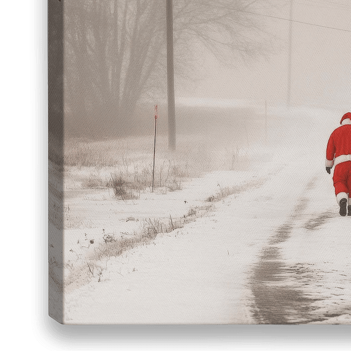 In een winterse omgeving, waar het zicht wordt belemmerd door dichte mist en zachte sneeuwval, wandelt een robuuste figuur in felrood over een eenzaam pad. Het contrast tussen de feestelijke outfit en de kale, ijzige omgeving creëert een melancholische stemming, terwijl mysterieuze sporen van anticipatie in de lucht hangen.