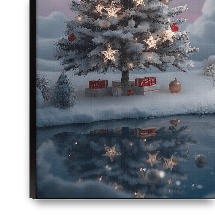 Breng rust, warmte en een vleugje magie in huis met dit betoverende schilderij. Een fonkelende witte kerstboom, zacht verlicht met warme lichtjes en versierd met rode en gouden accenten, staat centraal in een sereen winters landschap. Naast de boom waakt een vriendelijke sneeuwpop, weerspiegeld in het stille water, wat het werk een…