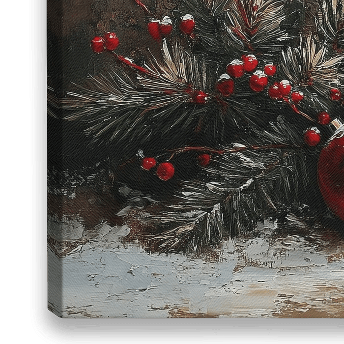 Kerstkaars | Rode Kerst Decoratie - Dit kerst schilderij toont een sfeervolle compositie met een brandende rode kaars, glanzende kerstballen, dennentakken en rode bessen, allemaal zorgvuldig gerangschikt op een rustieke ondergrond tegen een wazige, bruingetinte achtergrond.