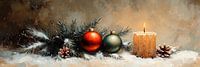 Kerstkaars - Dit kerstschilderij toont een sfeervolle compositie van roodgekleurde en groene kerstballen met een brandende kaars en sneeuw bedekte dennenappels en takken, die samen de warmte en gezelligheid van het kerstseizoen uitstralen.