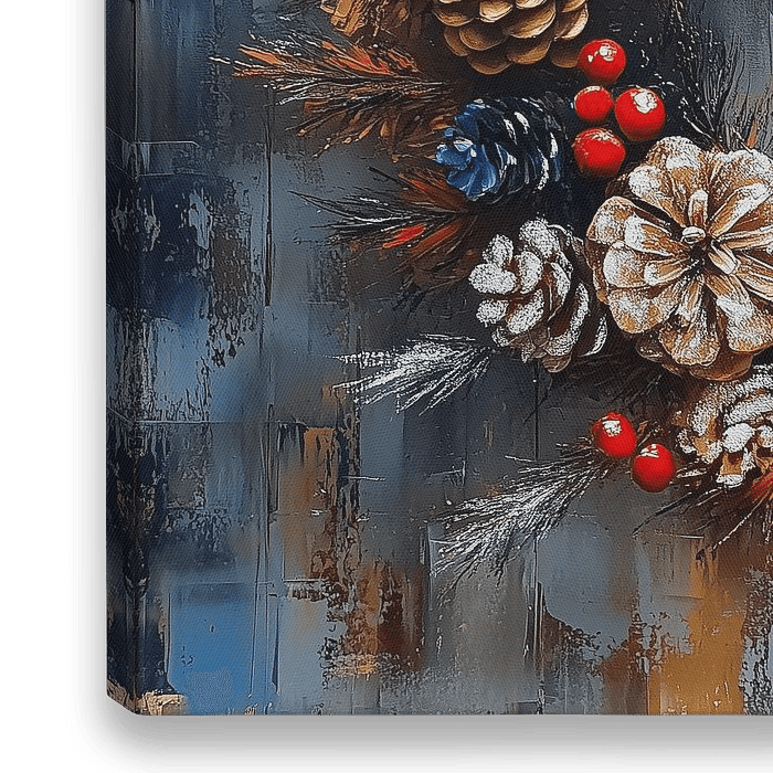 Kerstkrans | Rode Bessen Krans - Op dit kerstkrans schilderij zie je een grote moderne kerstkrans van dennenappels, felle rode bessen en een rood hulstblad, geschilderd in dikke impasto met realistische textuur tegen een grijsgemêleerde houten achtergrond, waardoor dit schilderij van een kerstkrans veel contrast en diepte…