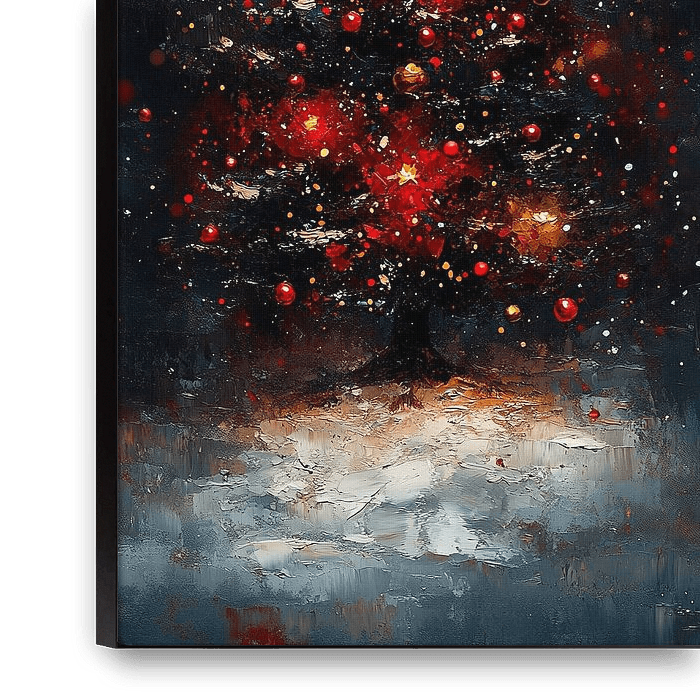 Kerstlicht | Fonkelende Kerstboom Sfeer - Dit Kerstmis schilderij toont een rijkelijk verlichte Kerstboom met heldere rode ornamenten en een schitterende ster bovenaan, geaccentueerd door energieke, kleurrijke spatten en een sfeervolle, donkere achtergrond.