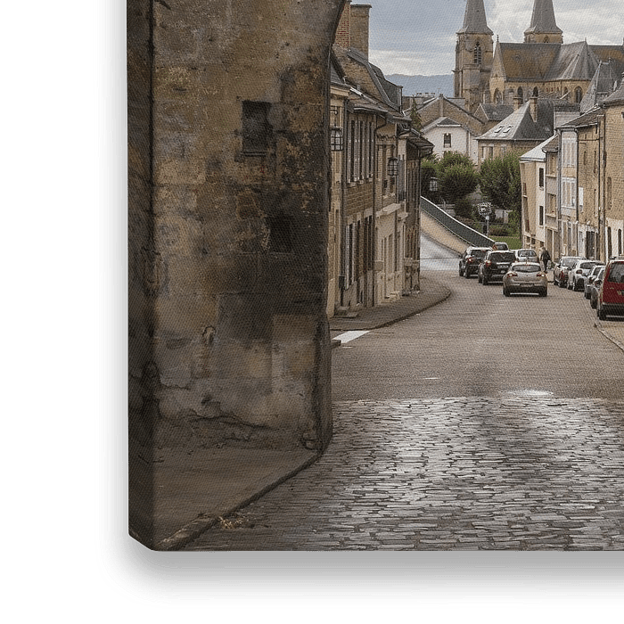 Als je door het middeleeuwse poortgebouw van Mouzon kijkt, krijg je een prachtig uitzicht op de stad, met zijn schilderachtige oude straatjes en torenhoge torenspitsen van de abdij. Een geweldige reisbestemming in de Ardennen in Noord-Frankrijk, en een leuk souvenir om aan je muur te hangen.