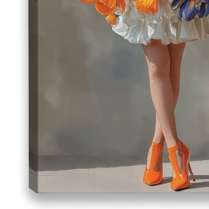 Een surrealistische portret van een gigantisch voorjaars boeket die het bovenlichaam van een vrouw bedekt, met daaronder haar benen met opvallende oranje schoenen met hoge hakken, in een realistische stijl.