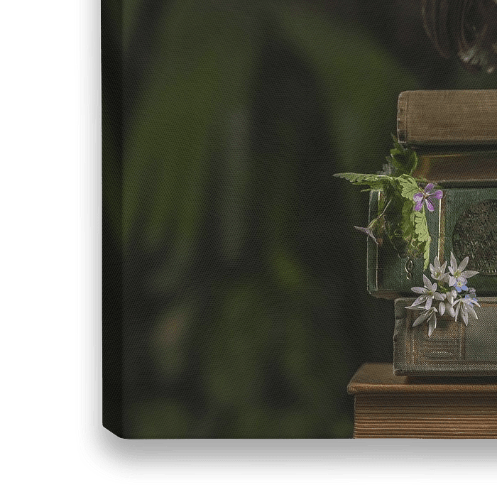 Hoe schattig is dit kleine krielkripje, met haar prachtige roze kanten kraag, ze staat op een stapel oude vintage boeken in de kleuren groen en goud. Tussen de boeken zitten stukjes varen en roze en witte bloemen. De achtergrond is een weelderige groene jungle. Je kan bij deze vintage foto van alles bedenken. Het licht is zacht en doet denken aan de oude schildermeesters zoals Rembrandt. Zeker met de kraag die een knipoog geeft naar de gouden eeuw met de molensteenkragen en plooikragen.