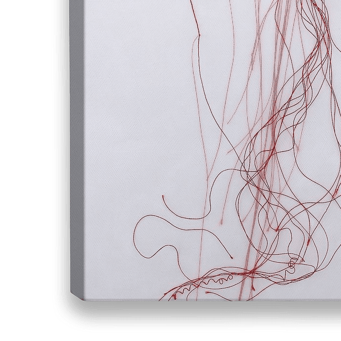 Een figuratief werk van een bijna kus, het is een werk van rood draad op doek. De sfeer van intimiteit en passie wordt versterkt door de kleur rood. De hangende draden geven een gevoel van beweging en stijging.