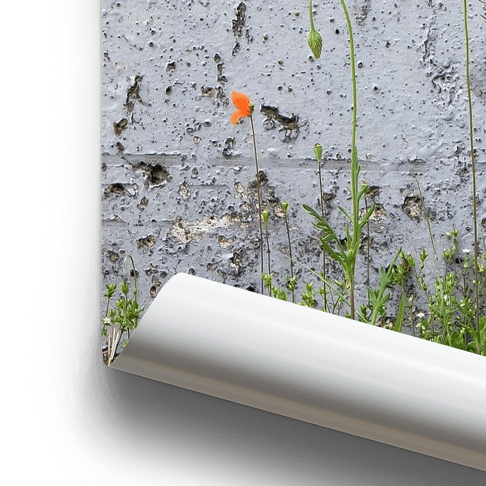 De vergane betonnen muur dient als een canvas voor de natuur. Hier groeit groen onkruid op de kieren en scheuren, als een zachte deken van leven die de rauwe randen verzacht. Het vormt een weelderige ondergrond waarop de klaprozen kunnen bloeien, een symbool van veerkracht in een ruwe omgeving.