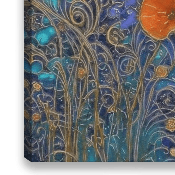 Een ritmisch samenspel van vurige klaprozen en turquoise accenten. Rankende lijnen slingeren door een botanisch reliëf vol fonkelende korrels, als abstracte juwelen op een energiek canvas. Gelaagde vormen onthullen telkens nieuwe nuances en creëren een organische diepte. Het spannende contrast tussen warme oranje schakeringen en koele…