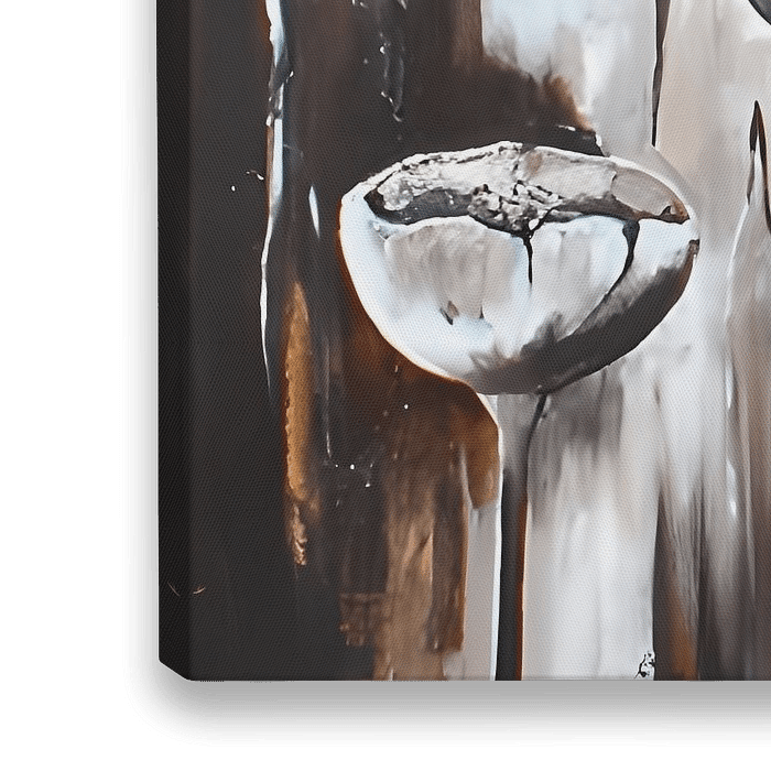Dit schilderij straalt een krachtige poëtische stilte uit. Tegen een donkere, bijna rokerige achtergrond rijzen bloemen op, wit en zilverachtig, als porseleinen kelken die licht vangen in een wereld van schaduw. De bloemen lijken te zweven, hun stelen oplossen in een nevel van aardse tinten — bruin, zwart en oker — wat een gevoel van vergankelijkheid oproept. De verfbehandeling is expressief: dikke lagen verf contrasteren met transparante sluierachtige vegen, alsof de kunstenaar het materiaal zelf heeft laten ademen. Het werk ademt zowel kracht als breekbaarheid; de bloemen lijken versteend, maar tegelijk vol leven. De compositie suggereert een fragiel evenwicht tussen bloei en verval, tussen licht en donker. De witte vormen lichten op als herinneringen die weigeren te verdwijnen. Dit schilderij is een meditatie over schoonheid, tijd en stilte — een ode aan de kwetsbare veerkracht van de natuur en de ziel.