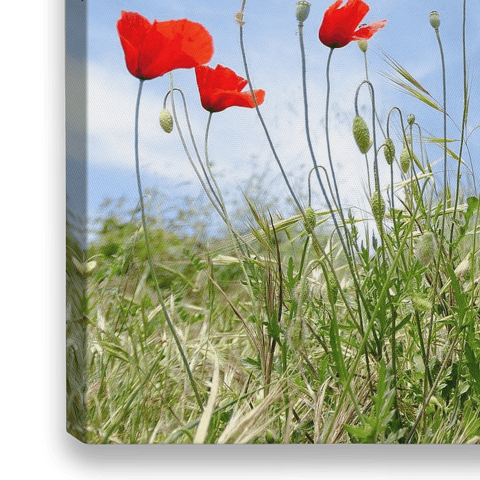 Vrolijke zomerse foto van klaprozen in een veld, die een prachtig contrast hebben met de blauwe lucht met sluierwolken.