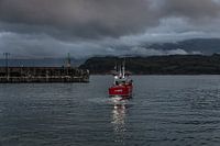 Een kleine vissersboort verlaat de haven van Lastres aan de noordSpaanse kust in de avond om 's nachts te vissen