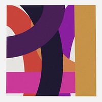 Dit schilderij is een abstracte compositie opgebouwd uit grote, overlappende vormen in heldere en contrasterende kleuren. Brede bogen en balken in donkerpaars, felroze, rood, oranje en goudgeel kruisen elkaar en creëren een dynamisch netwerk van lijnen en vlakken. De witte achtergrond geeft ademruimte en benadrukt de kracht van de…