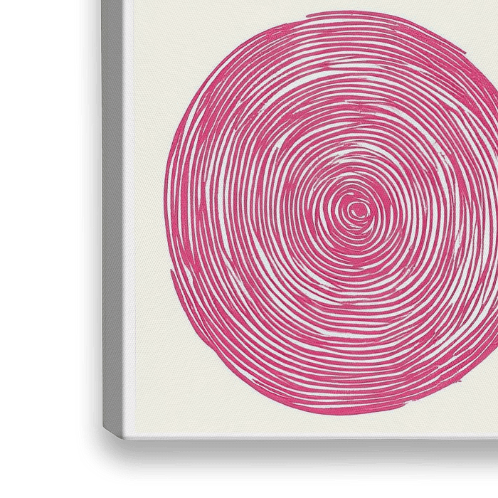 Kleurencirkels | Moderne Cirkel Schilderij - Dit abstract schilderij toont vier grote cirkels op een witte achtergrond, waarbij twee cirkels turquoise en twee roze zijn, allemaal bestaande uit fijne, spiralerende lijnen die vanuit het midden naar buiten toe lopen.