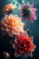 Dit kunstwerk onthult een betoverende compositie van dahlia's, badend in een mysterieus teal licht. De bloemen, variërend van zacht oranje tot levendig rood en delicaat roze, lijken te zweven in een etherische ruimte. Hun delicate petalen zijn met uiterste precisie weergegeven, waardoor een bijna tastbare textuur ontstaat. Het spel van…