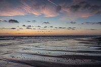 Kustlijn van Noordzee en Waddenzee vlak na zonsondergang De lucht en wolken zitten vol kleur Deze kleuren spiegelen op het natte strand.