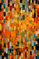 Een mozaïek van rechthoeken vult het vlak met diepe oranjes, vurige roden en gouden accenten. Tussen de warme tinten verschijnen koelere blauwen en groenen, die het geheel balans geven. De vormen liggen dicht tegen elkaar, alsof ze samen een glanzend tapijt van kleur en structuur vormen.