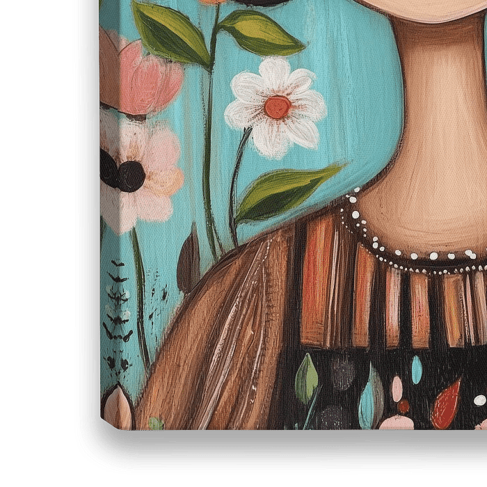 Kleurrijk en zomers portret, illustratie. Dit schilderij straalt een serene en dromerige sfeer uit, waarin de zachte gezichtsuitdrukking van de vrouw perfect samenkomt met de levendige bloemen die haar hoofd omringen. De heldere kleuren van de bloemen en de rustige, zachte tinten van de huid tonen een harmonieuze balans tussen natuur en…