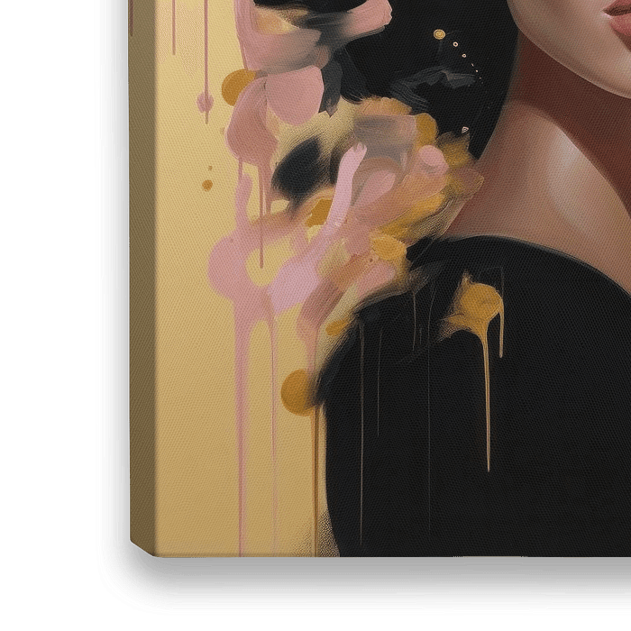 Kleurrijk, modern en abstract portret van een jonge vrouw in geel, zwart en roze. Kies zelf het formaat en het materiaal. Een echte blikvanger aan je muur!