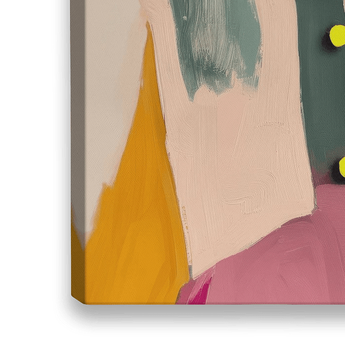 Dit werk lijkt rechtstreeks uit de modewereld te komen, waar kleuren niet botsen maar "flirten" en vormen elkaar niet aanvallen maar "omhelzen." De dame straalt een houding uit van "Ik ben kunst, kijk maar niet té lang." Haar fuchsia-roze wangen zeggen misschien: "Blush? Ik gebruik gewoon de hele tube." De mix van abstracte borstelslagen en de zelfverzekerde blik maakt dit een ode aan zelfexpressie. Het geheel is een cocktail van avant-garde mode en kunstzinnige flair, met een scheutje dramatische flair.