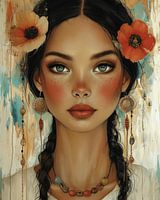 Kleurrijk portret, moderne illustratie van een jonge vrouw met bloemen in het haar. Kies zelf het materiaal en formaat bij dit werk en maak er een echte blikvanger van voor jouw interieur.