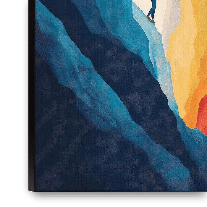 Een minimalistisch maar krachtig beeld van een eenzame wandelaar die zich een weg baant door een spectaculaire kloof. De dramatische contrasten tussen koele blauwtinten en warme oranje-rode kleuren creëren een surrealistisch landschap dat symbool staat voor de reis tussen twee verschillende werelden of gemoedsstemmingen. De kleine…