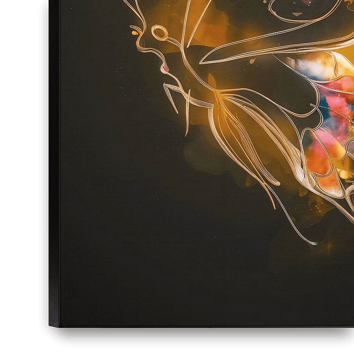 Dit kunstwerk betovert de kijker met een fusion van natuur en abstracte esthetiek. De afbeelding, die een vlinder in volle glorie toont, is een dans van lijnen en kleuren die over het canvas lijken te vloeien. De vleugels, versierd met een palet van levendige tinten – goud, oranje, roze en groen – contrasteren prachtig tegen de donkere…