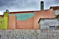 Kleurrijk beschilderde gebouwen in een grijze omgeving. Een gebouw, huis, is geschilderd in pastel roze groene en blauwe kleuren. Als het mijn huis was zou ik waarschijnlijk hetzelfde doen alleen maar om mezelf een blij gevoel te geven in een saaie omgeving. Een grijze betonnen muur beschermt het…