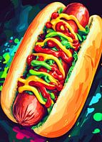 Een opvallende afbeelding toont een hotdog bedekt met heldere ketchup, mosterd en frisgroene ingrediënten. De gedurfde achtergrond en knalkleuren brengen het motief tot leven en geven het een energieke uitstraling. Dit kunstwerk is perfect voor mensen die houden van opvallende, kleurrijke motieven of die een moderne streetfood flair…