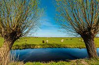 typisch Hollands landschap op een dijk met schapen en water deze met knotwilgen omlijste foto is een mooi plaatje.