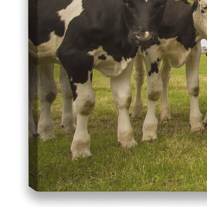 Een echte Hollandse foto een groep nieuwsgierige bonte koeien in het weiland met daarbij een Hollandse lucht.