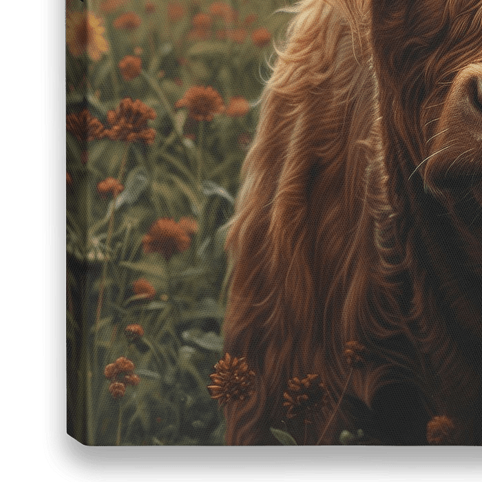 Koop dit schotse hooglander kunstwerk Koeienportret met zonnebloemkrans voor rustieke gezelligheid van Poster Art Shop als print op canvas, aluminium dibond, (ingelijste) fotoprint, behang en ArtFrame. Voor jou op maat geprint in Fine-Art kwaliteit.