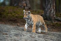 Royal Bengal Tiger / Koenigstiger ( Panthera tigris ), walking over rocks, on silent paws, full body, frontal side view, young animal, soft light.