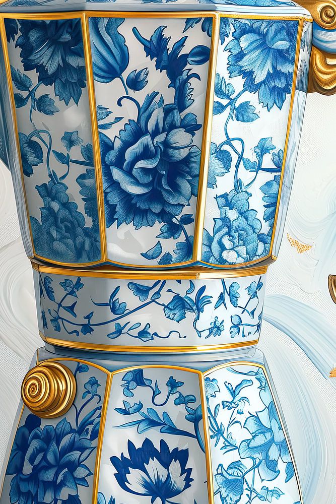 Schilderij van een Delfs Blauwe Percolator (koffiepot). Met een prachtig gouden handvat. Een stilleven in wit, blauw en gouden tinten.
