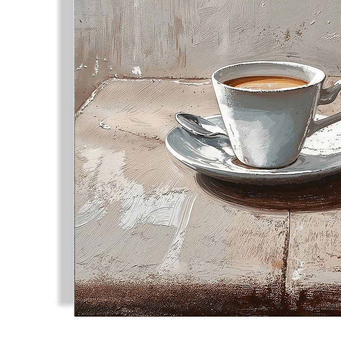 Prachtig schilderij van een Percolator (koffiepot) en een kop koffie. Op een houten keukentafel in het licht. Op de beige, grijze, taupe achtergrond ook een diagonale schaduw.