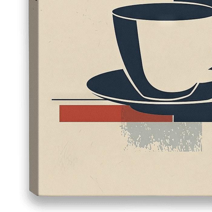Dit abstracte kunstwerk combineert geometrische vormen met een minimalistische voorstelling van een koffiekopje. De gedurfde, contrasterende kleuren rood, blauw en beige geven de afbeelding een moderne esthetiek. Dit kunstwerk is ideaal voor het decoreren van keukens en cafés en biedt een harmonieuze balans tussen kunst en design,…