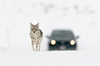 Coyote / Kojote ( Canis latrans ), in winter, high snow, walking on a road, followed by a car, seems to be totally undisturbed, Yellowstone NP, Wyoming, USA.