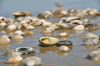 Schelpen van de (gewone) kokkel. De kokkel is een in zee levende tweekleppige weekdiersoort. Andere namen zijn 'eetbare hartschelp' of 'kokhaan'.