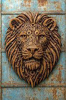 Dit kunstwerk toont de indrukwekkende kop van een leeuw, opgebouwd uit talloze boutjes, moertjes, metalen platen en andere onderdelen. Hoe langer je kijkt, hoe meer details je ontdekt: de manen bestaan uit verroeste schroeven en veren, terwijl de ogen en snuit zorgvuldig zijn gevormd uit ronde metalen ringen en tandwielen. Het roestbruin van het ijzer contrasteert krachtig met de verweerde blauwgroene achtergrond, waardoor het portret een stoere en industriële uitstraling krijgt.