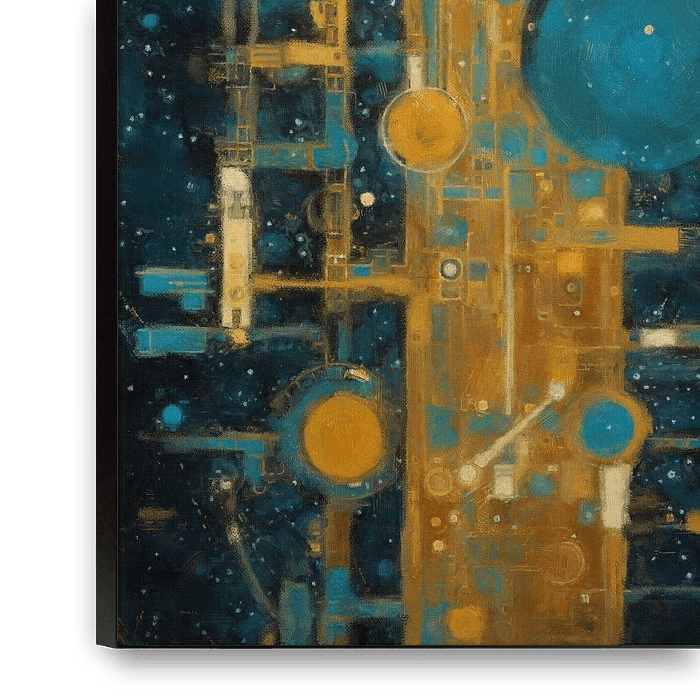Dit werk toont een ruimtestation dat lijkt te zweven in een zee van sterren en planeten. De geometrische vormen en circuits van het station zijn geschilderd in gouden en blauwe tinten, wat een fascinerend contrast vormt met de donkere, sterbespikkelde achtergrond. De ronddraaiende banen en hemellichamen die het station omgeven…