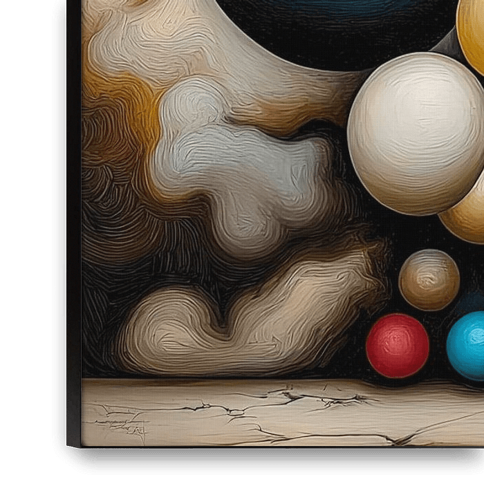 Deze fascinerende foto is als een portaal naar een andere dimensie waarin kleuren, vormen en structuren harmonieus in elkaar overgaan. In het midden staan talloze bolvormige objecten van verschillende grootte die gewichtloos in de ruimte lijken te zweven. Elke bol vertelt zijn eigen verhaal - van zachte crèmekleuren en aardetinten tot…