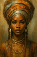 Een tijdloos portret van een vrouw vol kracht, schoonheid en waardigheid. De warme kleuren, traditionele sieraden en expressieve blik vertellen een verhaal dat resoneert met trots en cultuur.