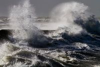Zuidpier van IJmuiden tijdens een herfst storm aan de Hollandse kust. Metershoge golf laat de vuurtoren geheel verdwijnen. De kracht van de golven en de Noordzee zijn duidelijk zichtbaar tijdens deze storm.